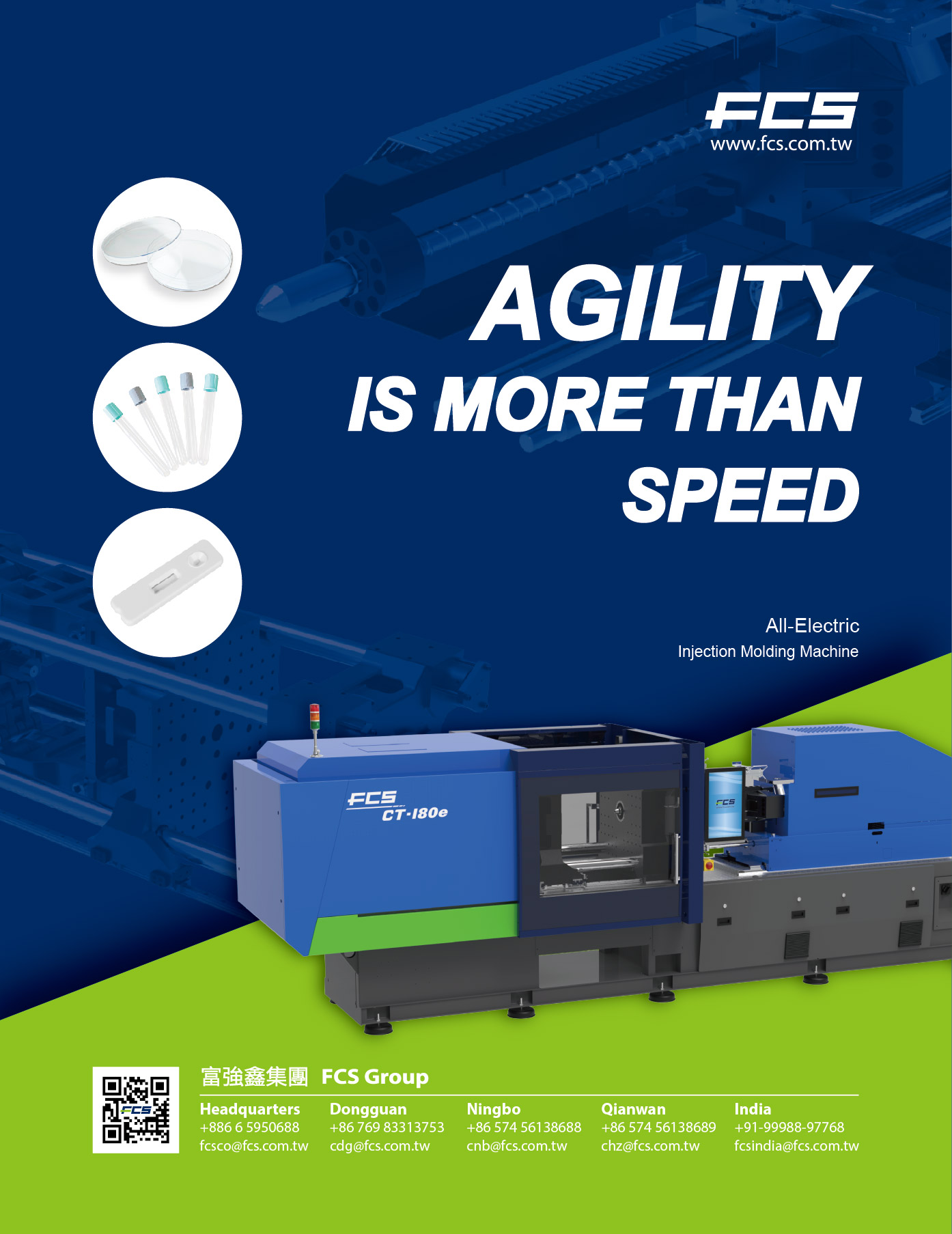 Las máquinas de moldeo por inyección totalmente eléctricas de la serie CT-e son un nuevo modelo de FCS. Se utilizan en industrias como la de embalaje, componentes ópticos, medicina y electrodomésticos 3C, como computadoras portátiles o piezas de impresoras multifunción, entre otras. Su fuerza de cierre oscila entre 50 y 1100 toneladas.